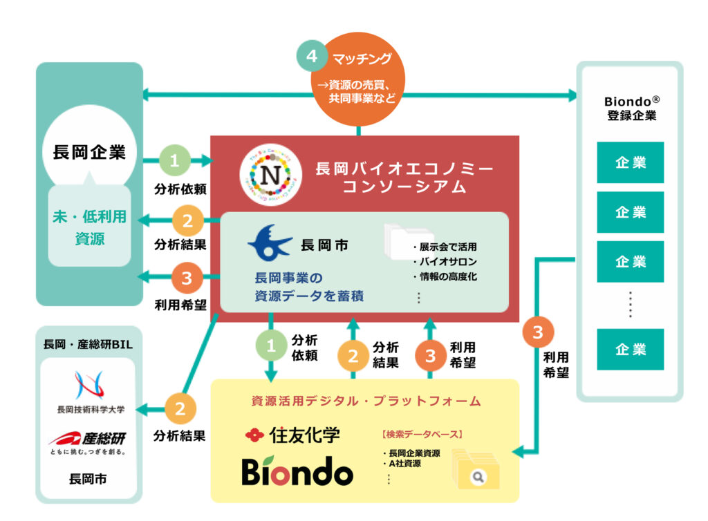 昨年9月、「長岡バイオエコノミーコンソーシアム」は、住友化学(株)と連携し、素材の「成分分析」「検索データベース」「取引先開拓(マッチング)」の3つの機能を持つ日本初のデジタル・プラットフォーム「Biondo®(ビオンド)」のシステムを活用した事業を開始した。