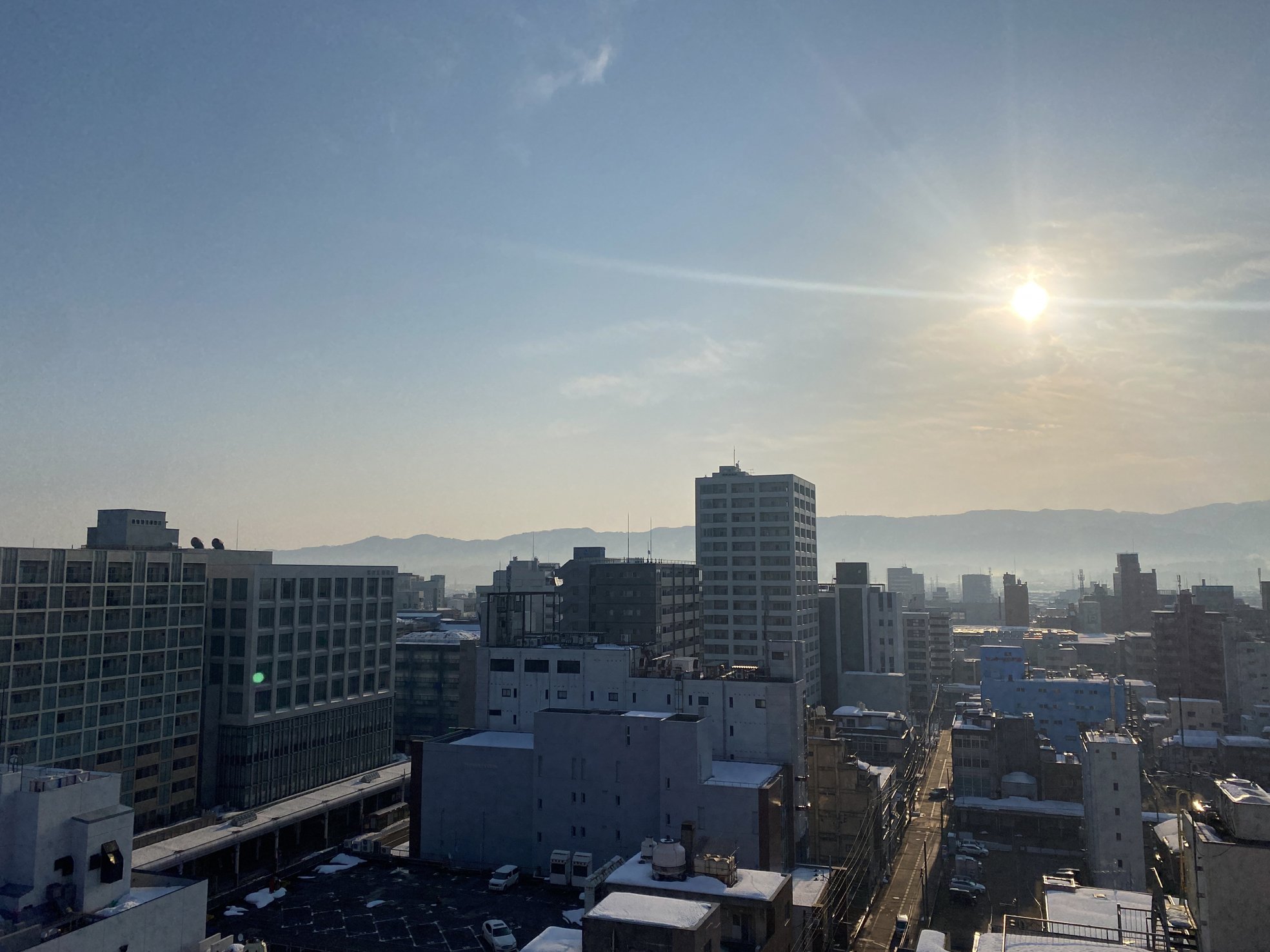 信濃川から長岡駅前を臨む(令和7年2月28日撮影)