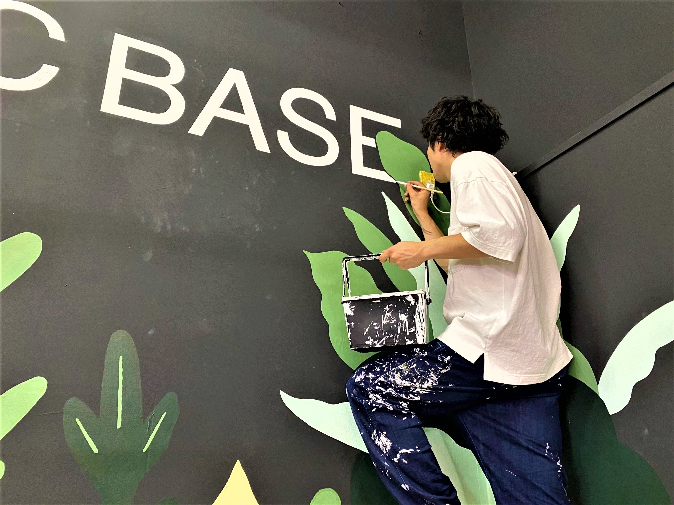 NaDeCBASEナデックベ-ス (起業創業の拠点/市民センター地下)の壁面をペイントする造形大卒のグループ「クリエイターユニット401」のメンバー。既存の建物やガラスを活用したデザインで活動の幅を広げている。