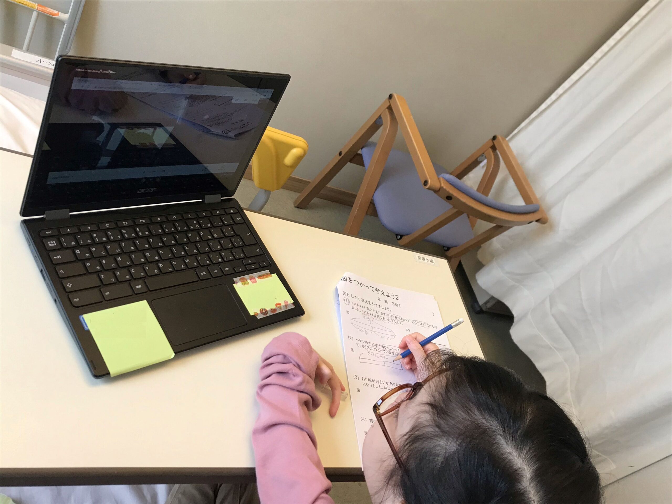 タイトル画像: 病室(長岡赤十字病院)で学習する入院児童