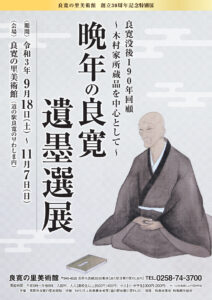 いま、良寛没後190年を回顧して「晩年の良寛遺墨選展」を11月7日(日)まで開催している。良寛が晩年を過ごした木村家所蔵の書状など、普段は公開されない貴重な品々が約40点並ぶ。