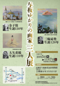 10月5日(火)からは「与板ゆかりの画家 三人展」が開催される。日本画壇の重鎮 三輪晁勢、大矢黄鶴(長岡市名誉市民 大矢紀画伯の父 )、洋画家 金子保の見ごたえのある大作約20点が展示される。