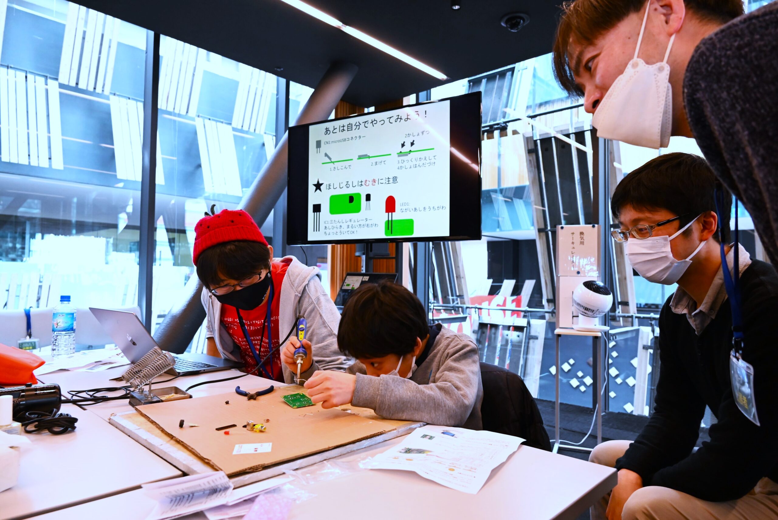 画像は、はんだづけとプログラミングを組み合わせた体験コーナー