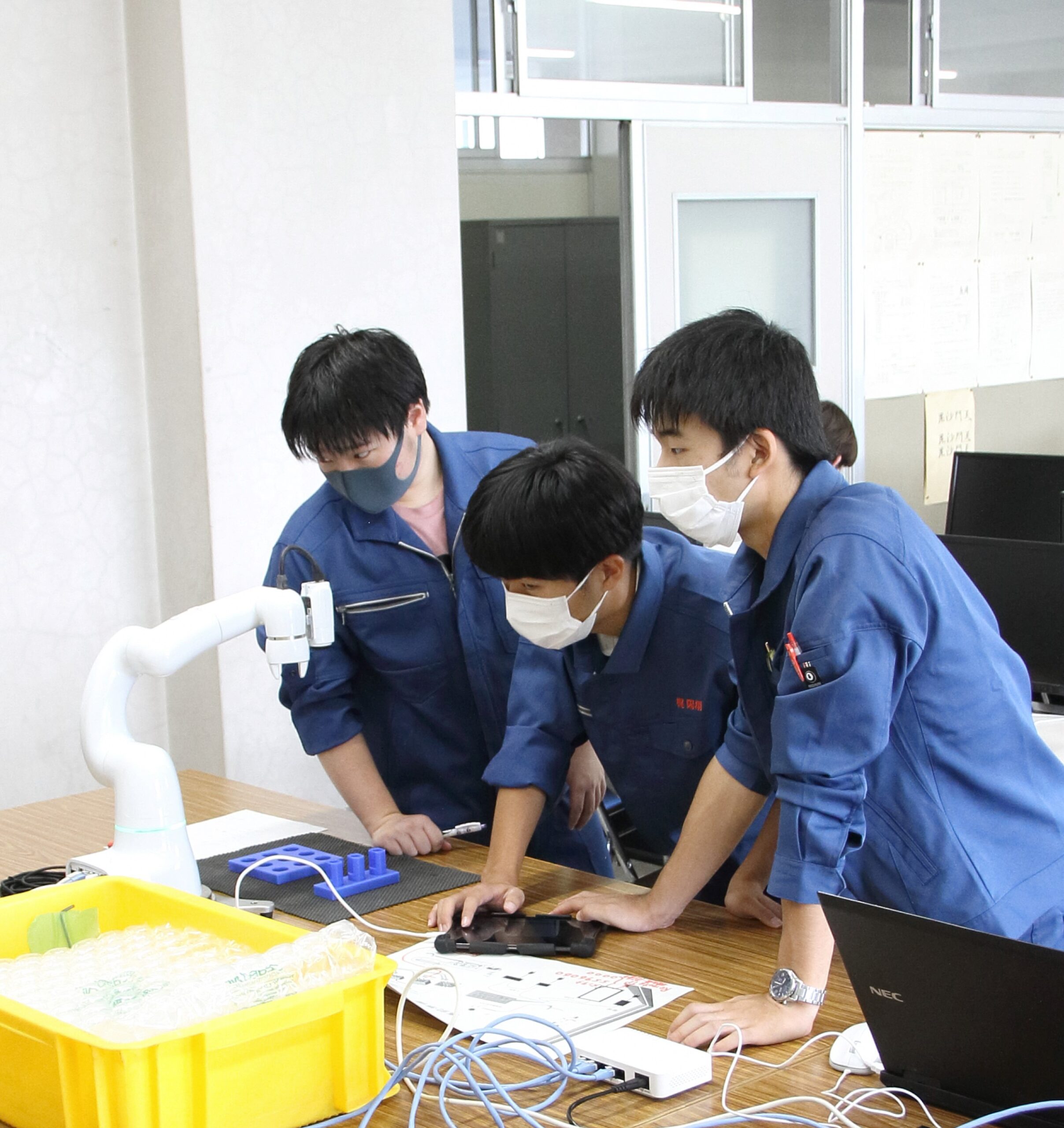 機械工学科電子機械コース3年生40名を対象に、産業用ロボットを使用したプログラム作成と実習が行われている(講習全12回)。市内のものづくり企業が実習の講師を務め、最新のロボットを貸し出すなどして、実践的な学生の学びを主導している。