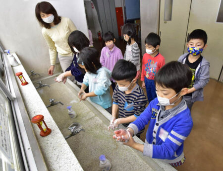 タイトル画像: 休み時間に手洗いする子どもたち 新組小学校 (R2.4.10)で