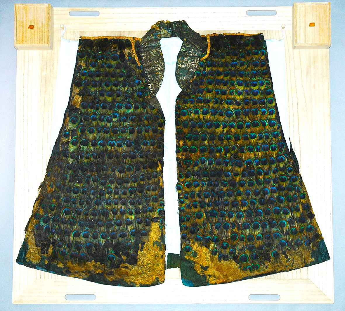 さて、この陣羽織を見てみると──400年以上の歳月を経ているため傷みや風化は見られるが──平成18年度に行った修復で孔雀の羽の色彩が鮮やかに蘇っている。また、孔雀の尾羽の毛先を切り揃えることで、尾羽の美しさを際立せるなどのこだわりも随所に感じられ、一見の価値ありだ。