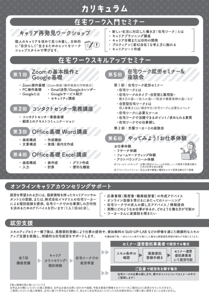 セミナー受講後も、希望者には就労向けオンライン面談や、セミナー運営委託事業者による仕事提供などの支援を行うほか、在宅ワークにチャレンジする方を後押しできるような対面型の交流企画を実施し、ネットワークづくりを推進する予定だ。