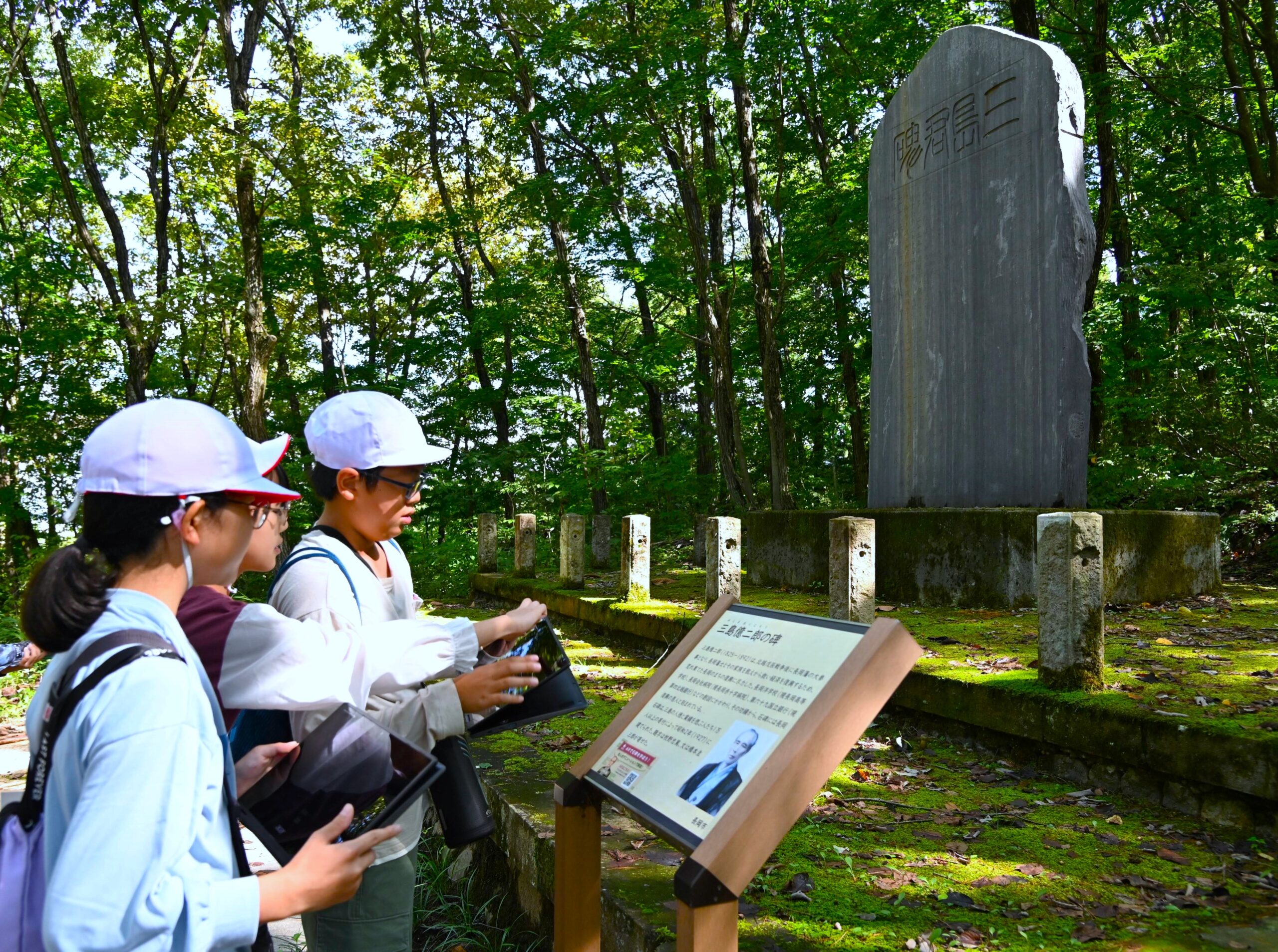 栖吉小学校の児童が園内を散策し、タブレット端末から石碑巡りやAR解説を体験した。